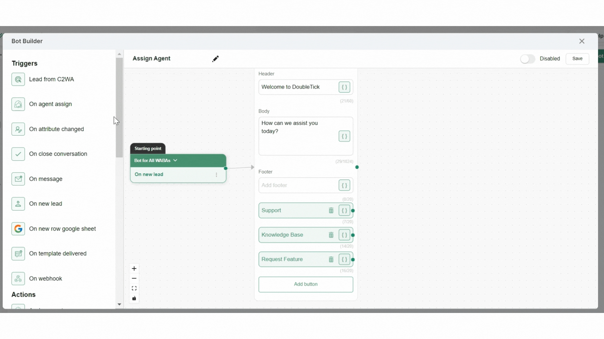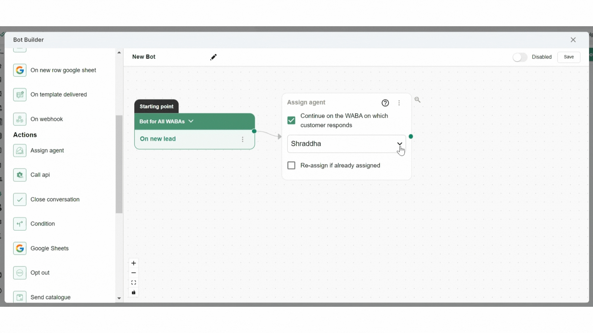 We'll illustrate how to streamline the process of assigning an agent to manage customer inquiries without manual intervention. With the "Assign Agent" action feature in JugaadX Bot, you can effortlessly configure automatic agent assignment triggered by customer actions such as clicking on designated buttons or typing predefined keywords.