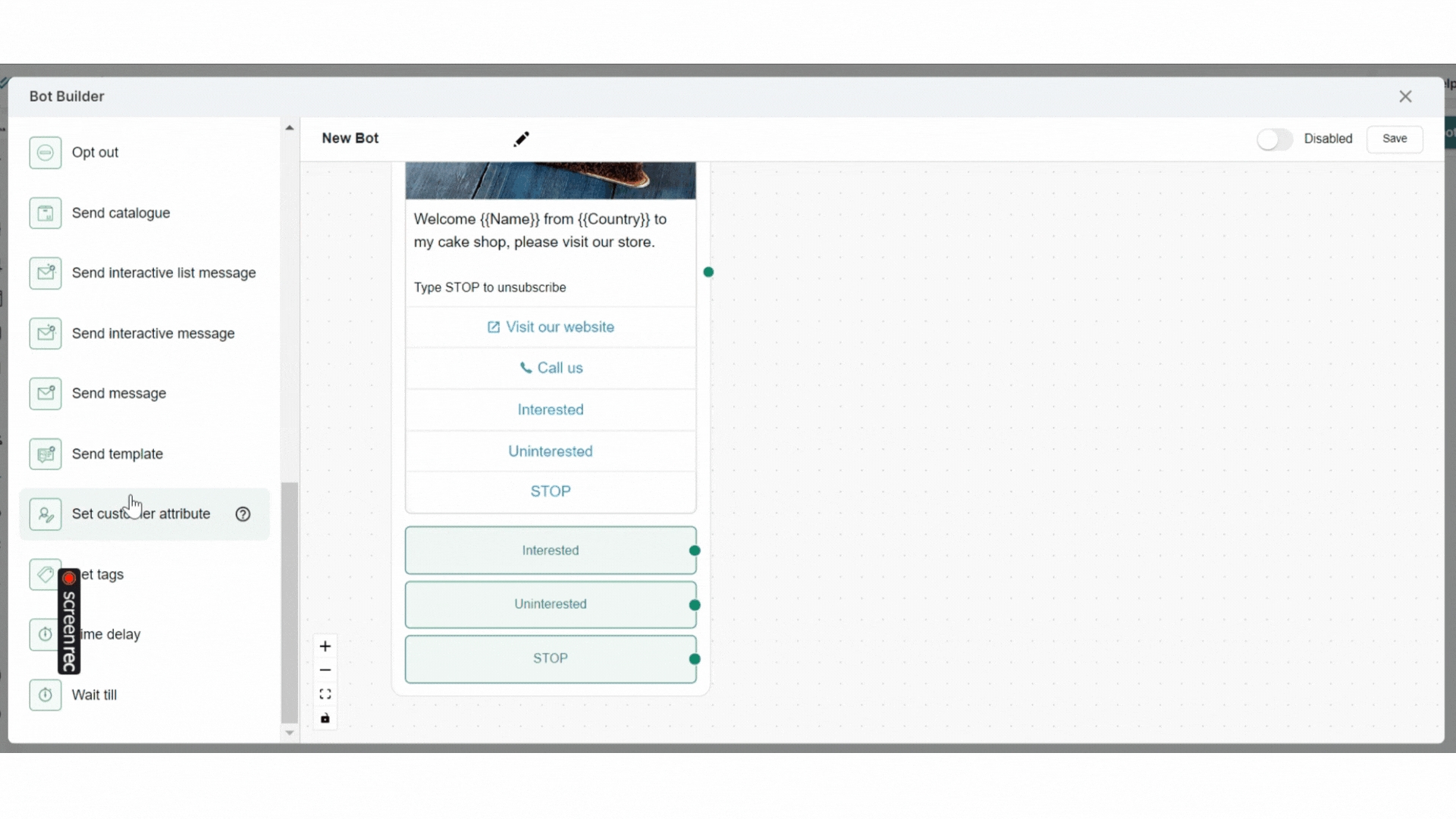 Customer Response Handling - Customer Attribute Action: Upon selecting one of the buttons, the bot captures the customer's response using the Customer Attribute Action. The selected category is stored as a customer attribute for future reference.