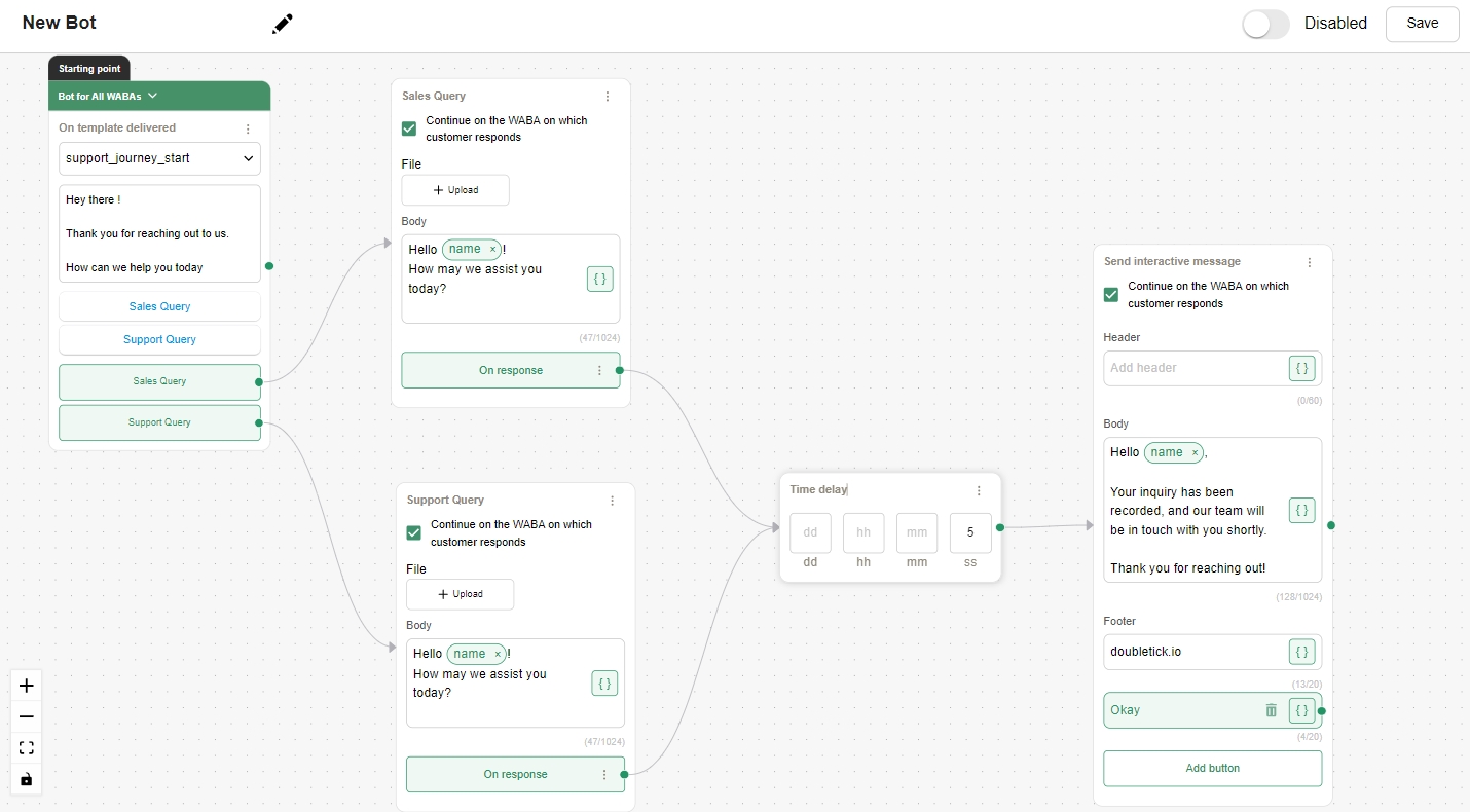 Imagine you're managing a customer support chatbot for an e-commerce platform. After a customer initiates a query, you want to provide them with automated responses while ensuring they don't feel overwhelmed by rapid-fire messages. Here's how you can leverage the "Time Delay" action: