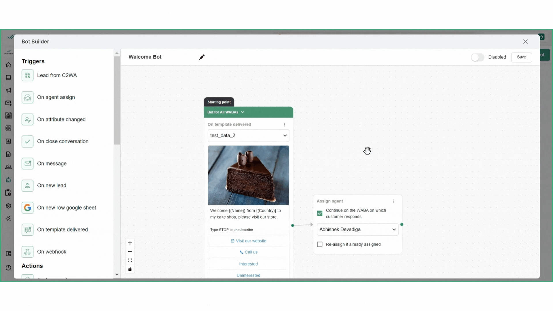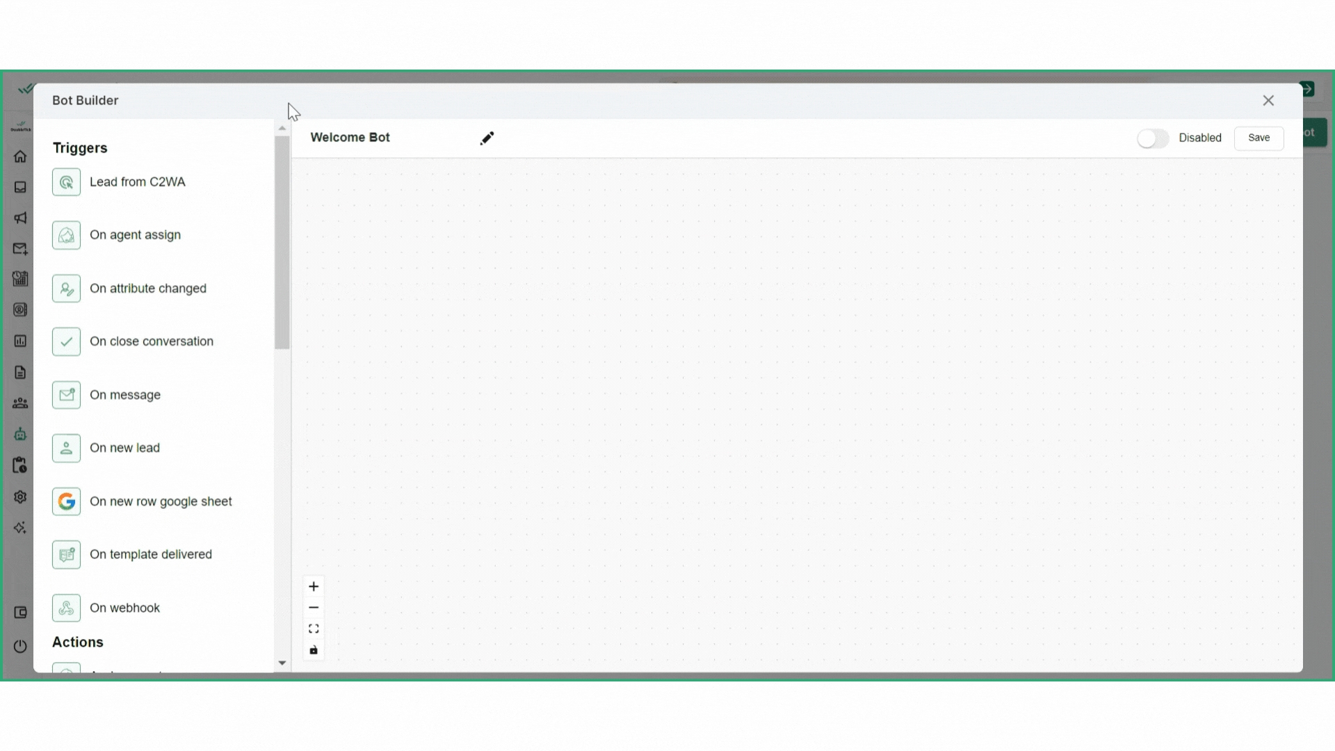 The side panel consists of triggers and actions; triggers are the starting point that initiate bot responses, while actions determine what the bot does in response to those triggers.