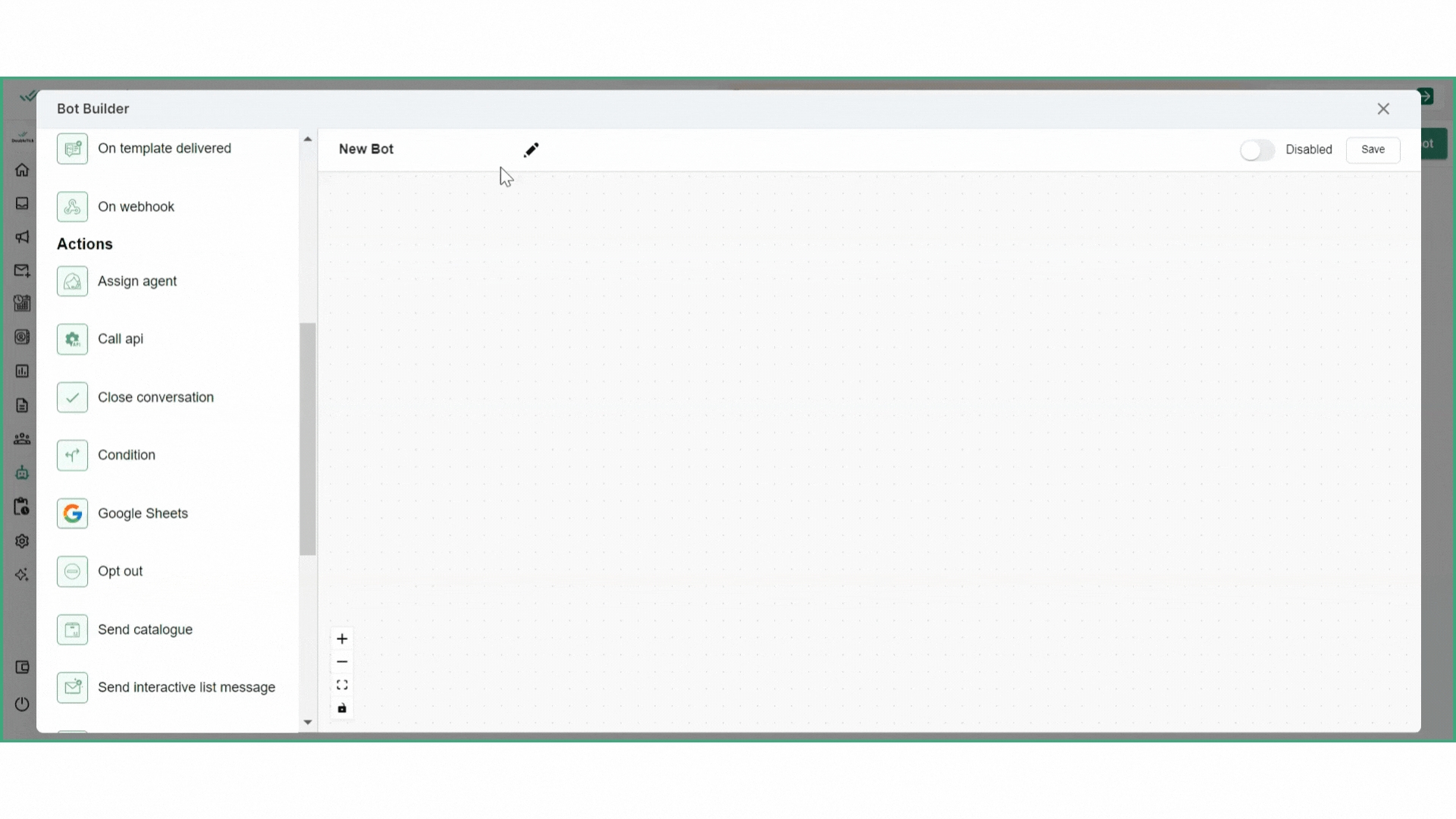 Zoom Out: Zoom out to get a broader view of your bot flow, enabling you to see more of the flowchart at once and understand its overall structure.