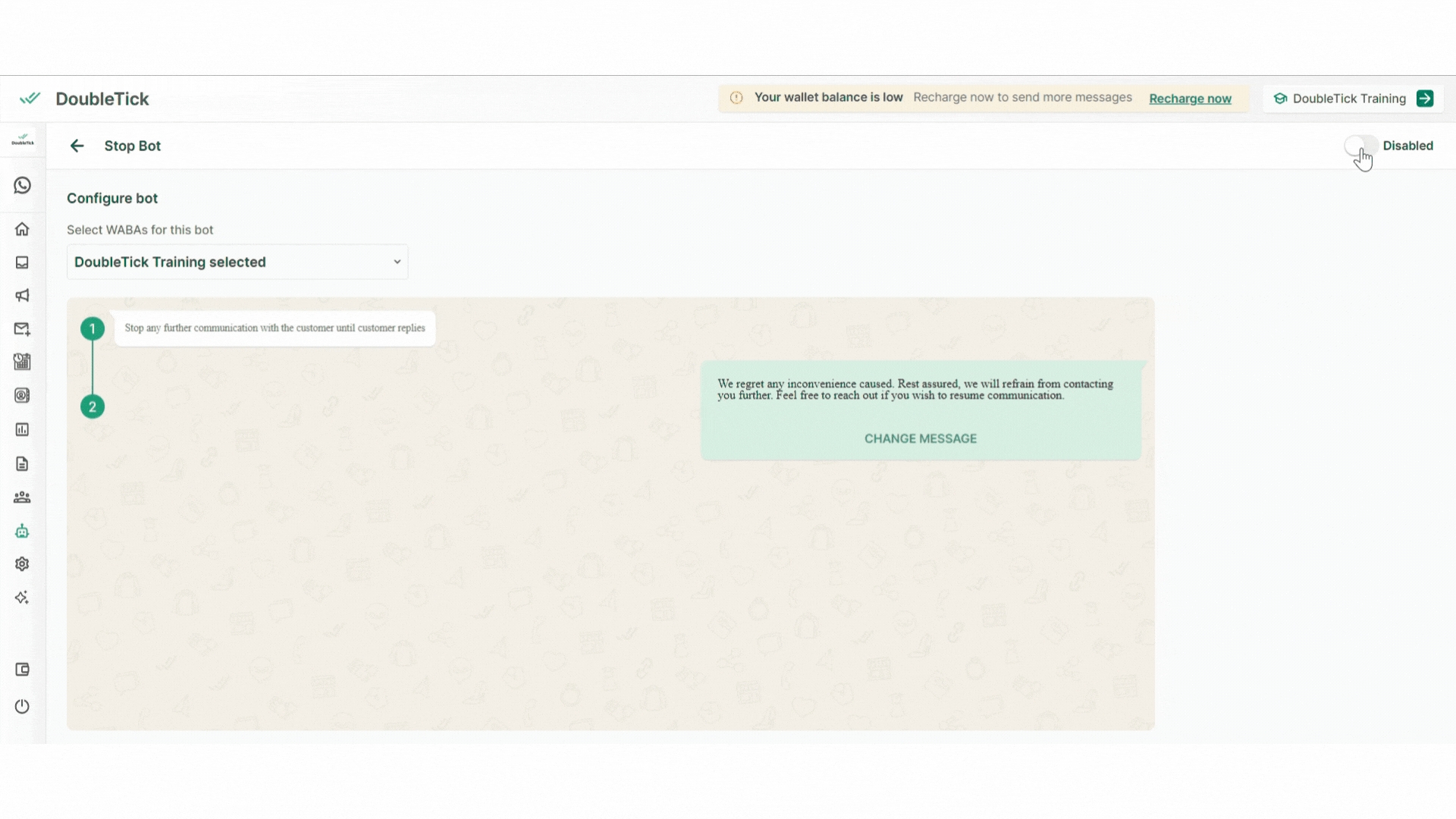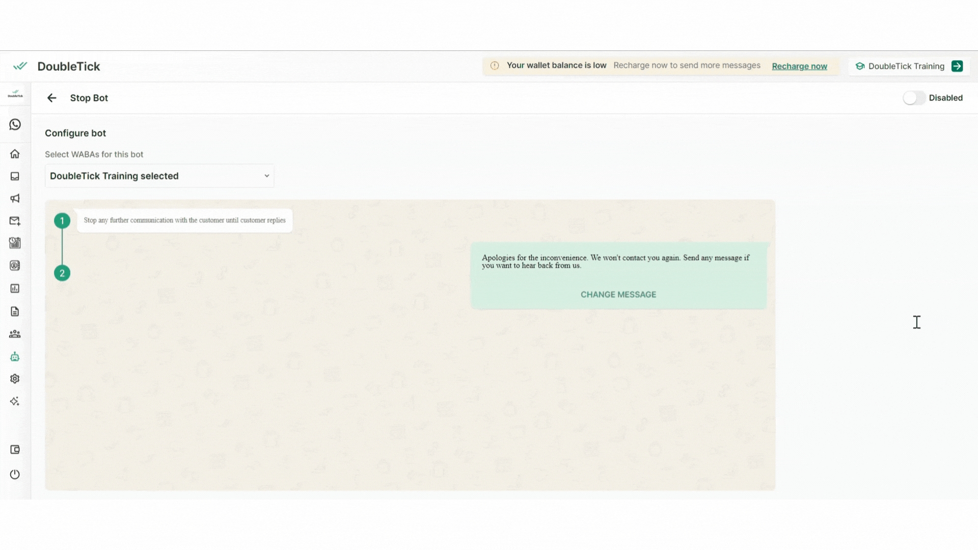 Upon encountering the keyword "STOP" in any customer interaction, the Stop Bot immediately halts any further communication attempts.