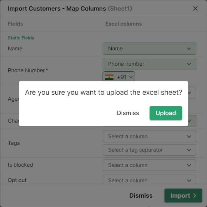 In this dialog box, you'll need to map the fields from the Excel file to the corresponding fields in the system. This ensures that the data is correctly imported and aligned with the appropriate fields in your system.