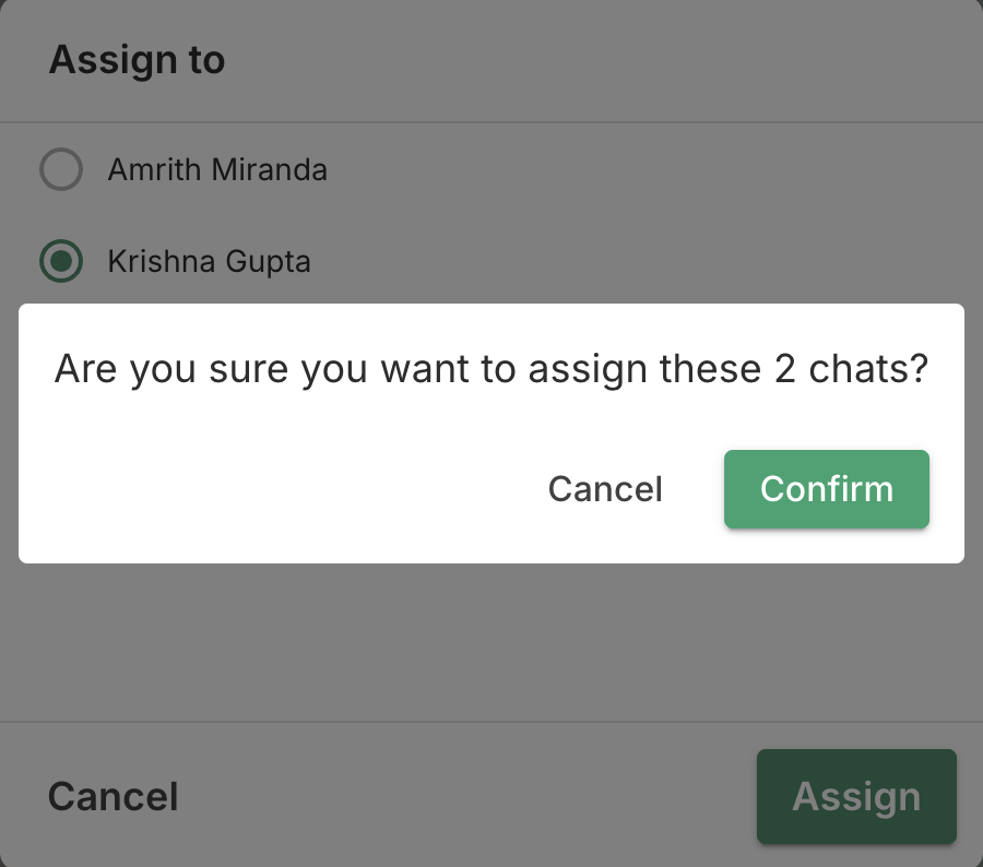 A "Assign to" pop-up will appear; choose the agent you want to assign the conversation to and click on "Assign"