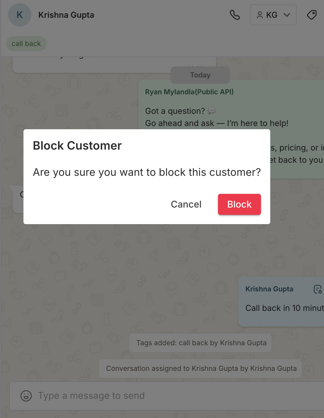 Customer Blocked Status will Appear on Chat Screen