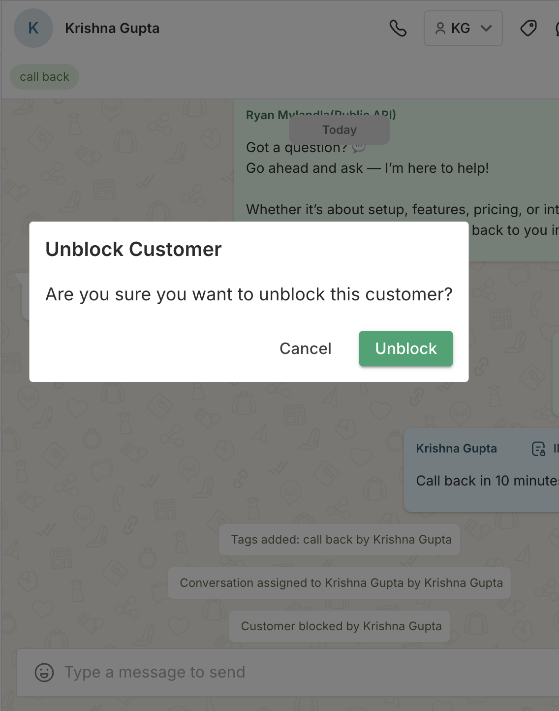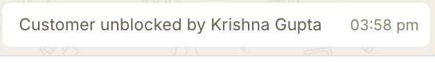 Customer Unblocked Status will Appear on Chat Screen
