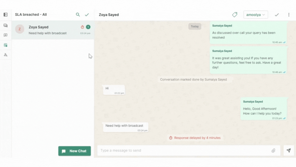 Once the SLA time is breached, the chat will automatically move to the "SLA Breached" filter, making it easier for agents to identify and prioritize chats requiring immediate attention.