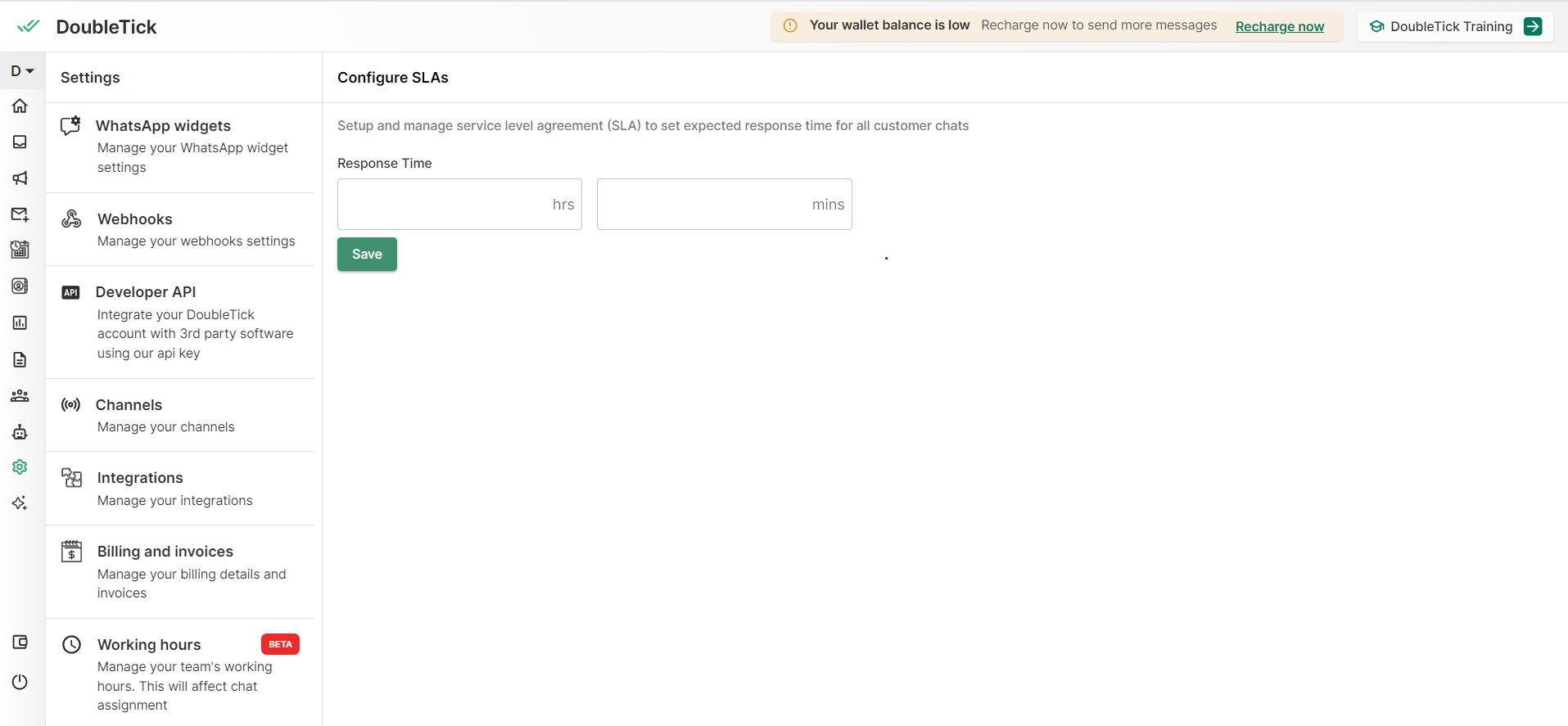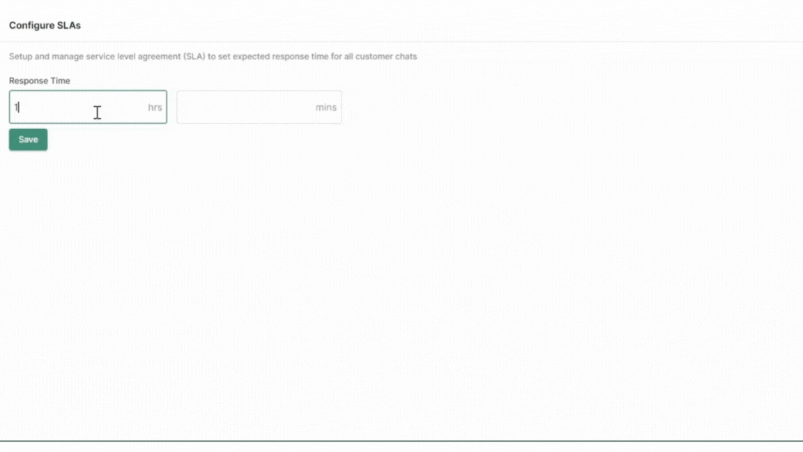 Enter the response time in hours and minutes, then click on the "Save" button to finalize your SLA configuration