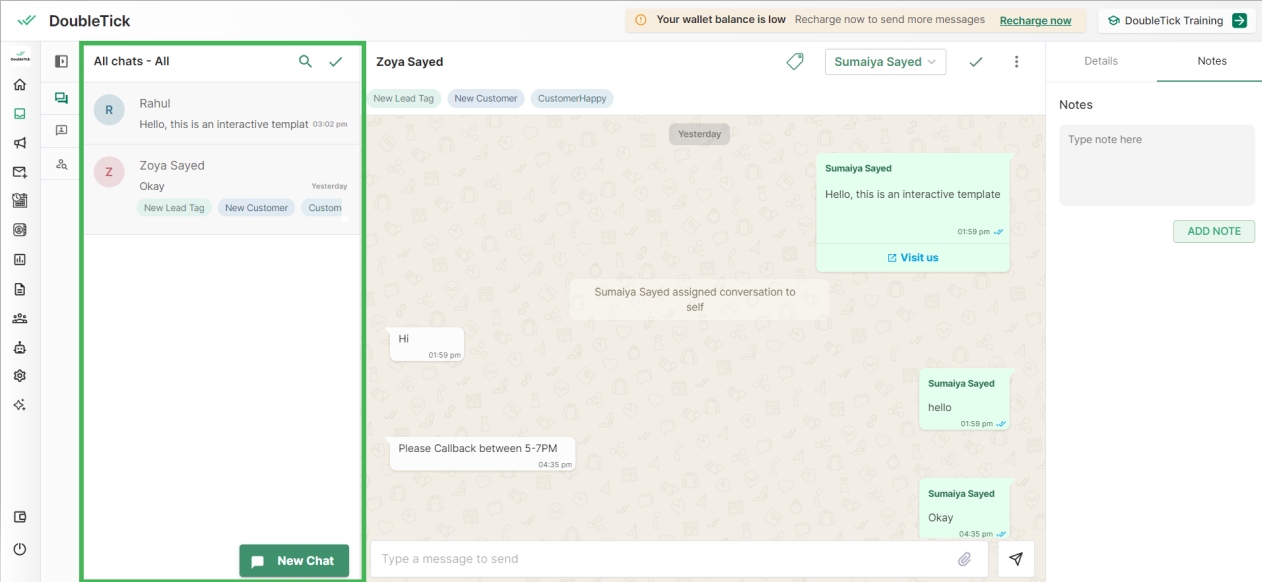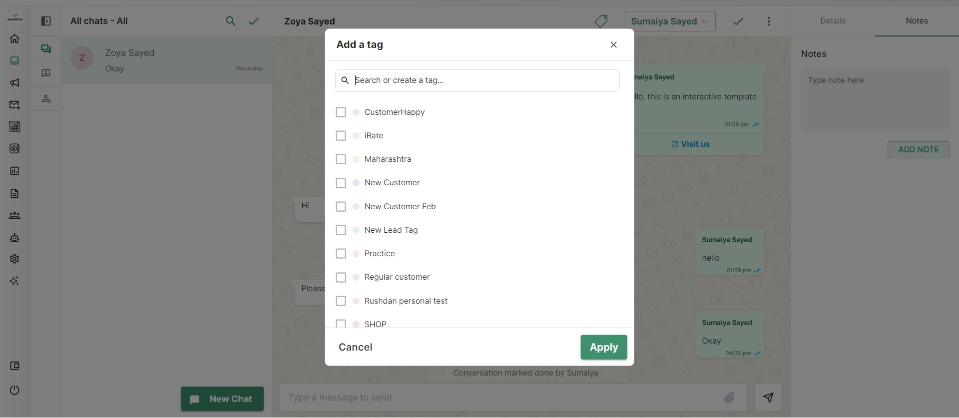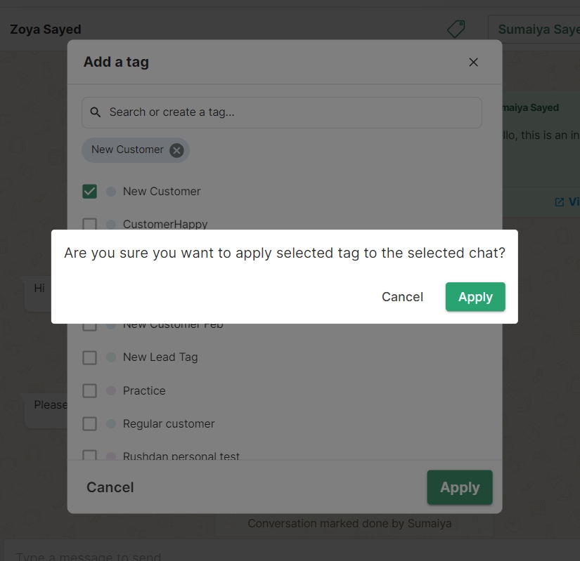 on Chat ScreenOn click on the tag icon, an "Add a Tag" pop-up will appear, displaying a list of all existing tags