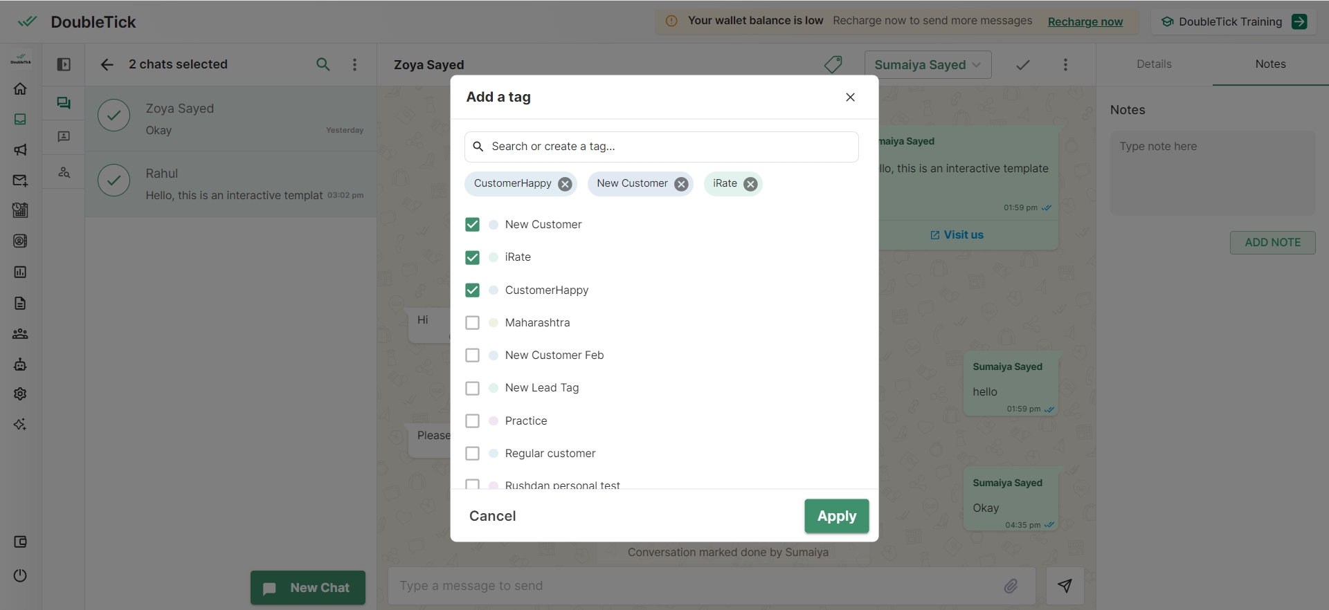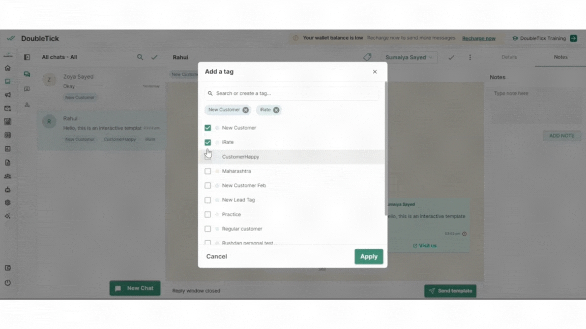 "Add a tag" pop-up will appear; choose the tags you want to assign to the customers and click on "Apply"