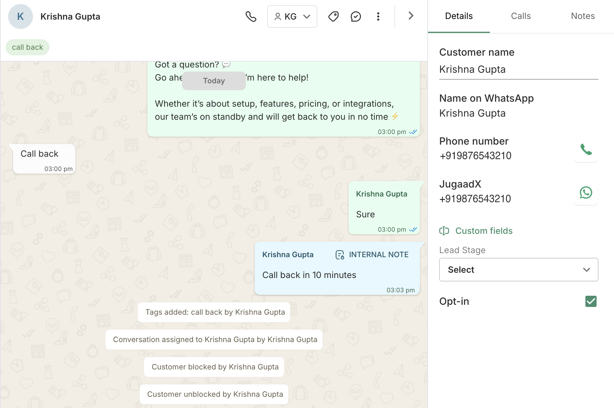 Simply select the conversation, and in the Details panel on the right, look for the "Opt-in" option. If the option is enabled; has a check mark, it indicates that the customer has opted in for chat communication.