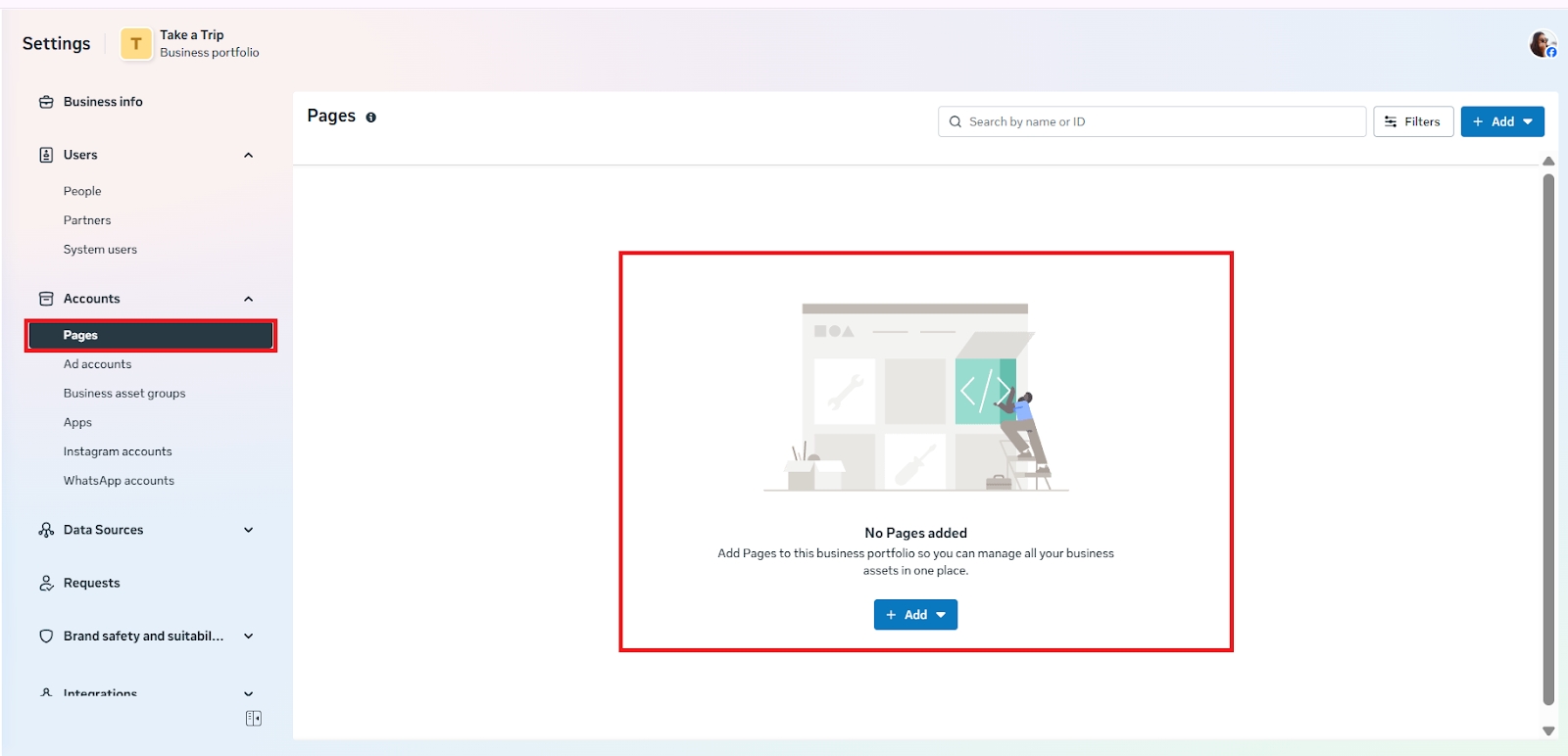 Go to Business Settings → Accounts → Pages.