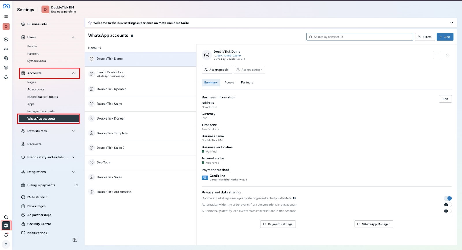 Navigate to Business Settings → Accounts → WhatsApp Accounts.