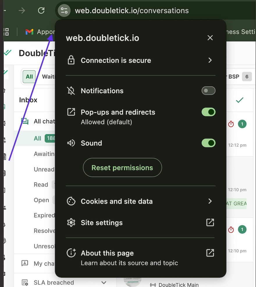 " before the url bar of your browser or the "View Site Information" option in your browser or app settings.A dropdown menu or pop-up should appear, displaying site-specific settings