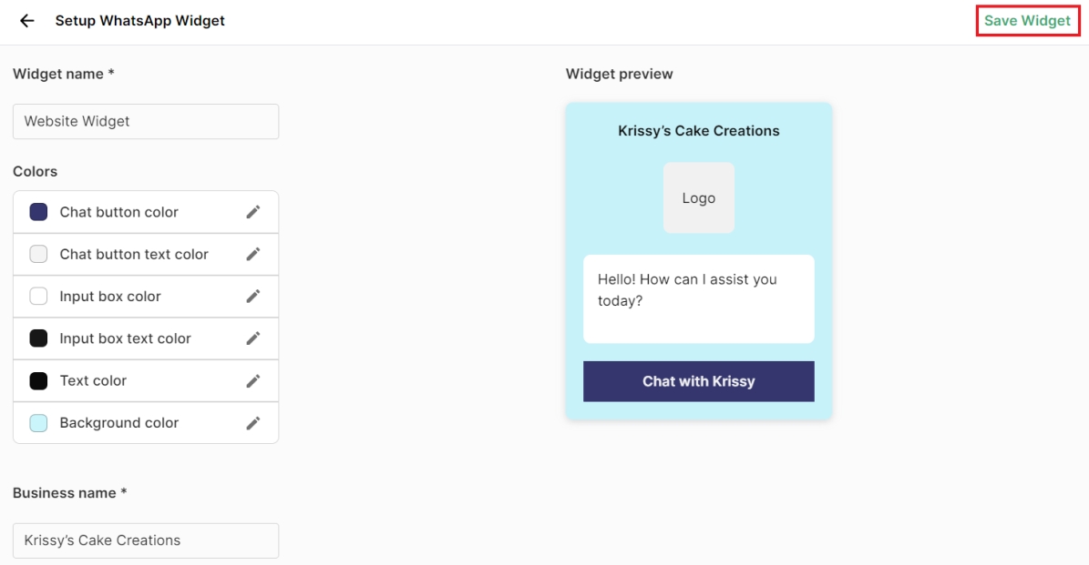 The setup WhatsApp widget page will appear