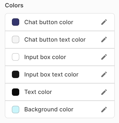 You can customize the look of the widget. You can adjust the color for the chat button, chat button text, input box, input box text, text color, and background color according to your preference