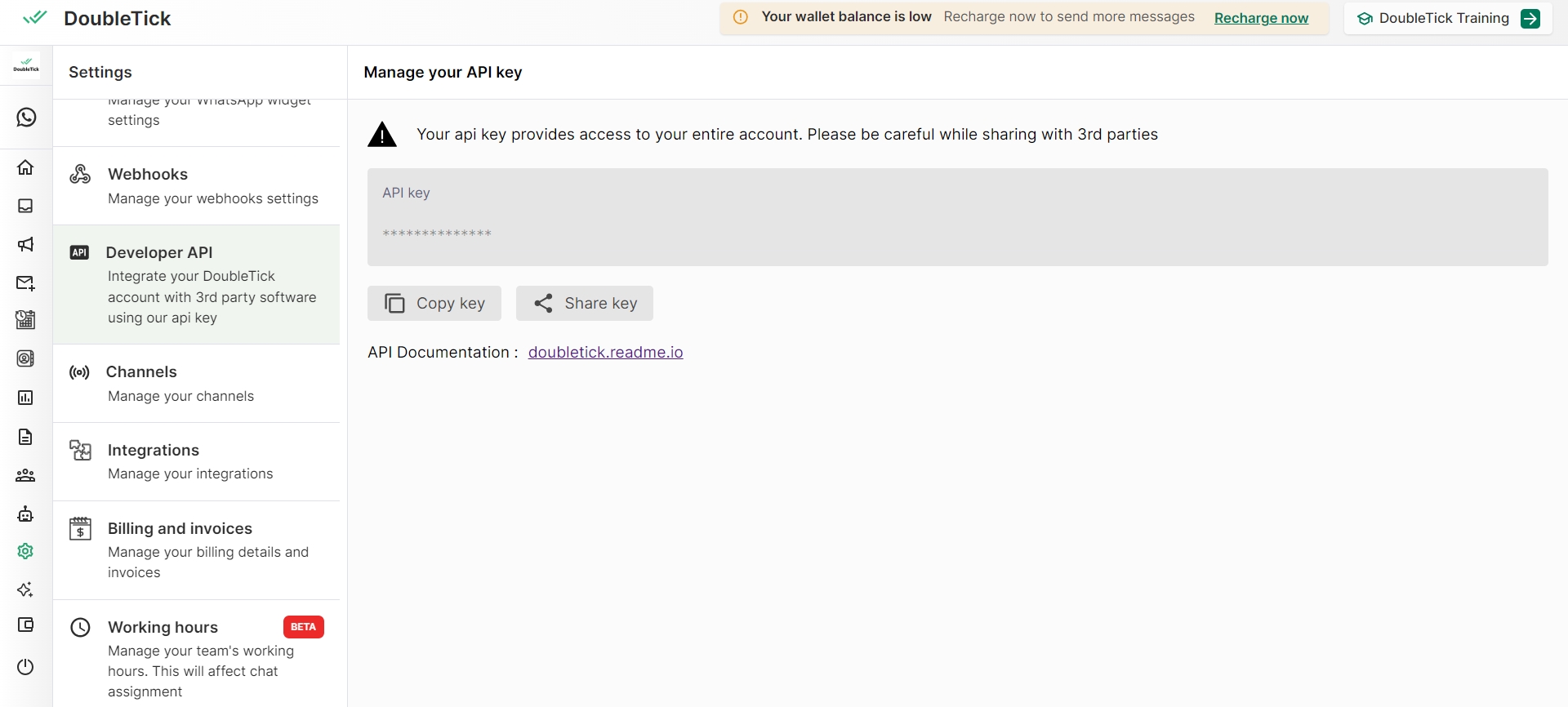 Share the API key and documentation with your developers for system-based integrations like SAP or ERP. This ensures they understand the integration process and implement it effectively.