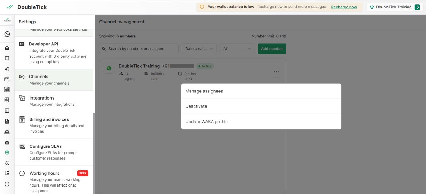 In addition to accessing details about your WABA, the Channels section also offers robust management capabilities: