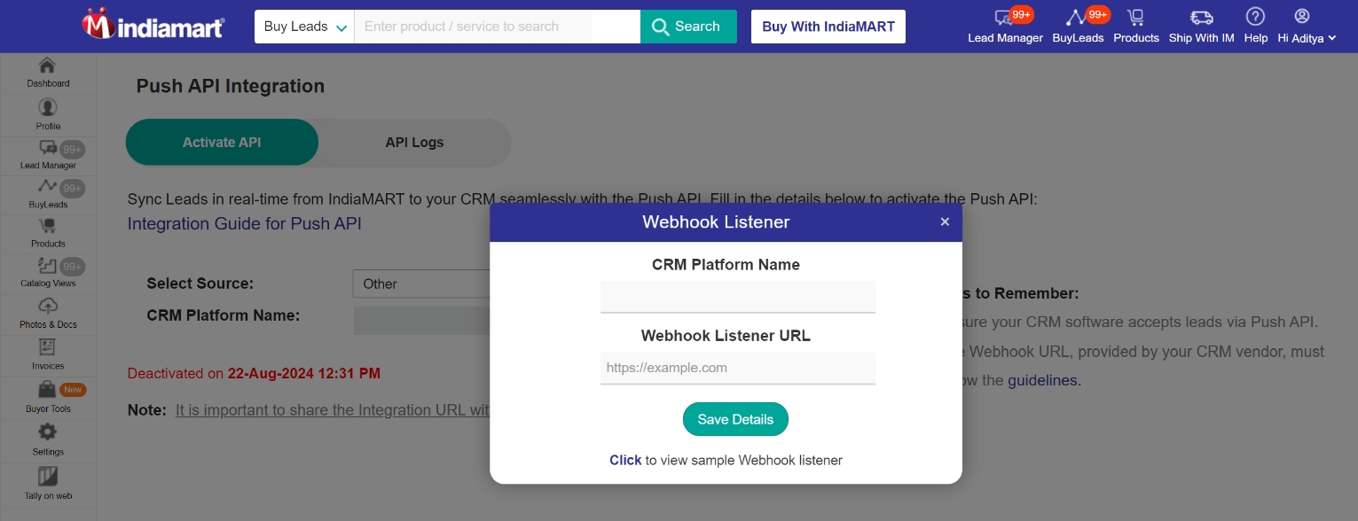 Configure IndiaMART Webhook: