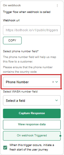 Choose the phone number filed in the On webhook node after capturing a test data in the webhook.
