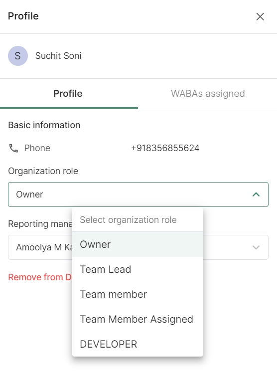 Now, from the dropdown menu, select the WABA role you wish to assign the Team member