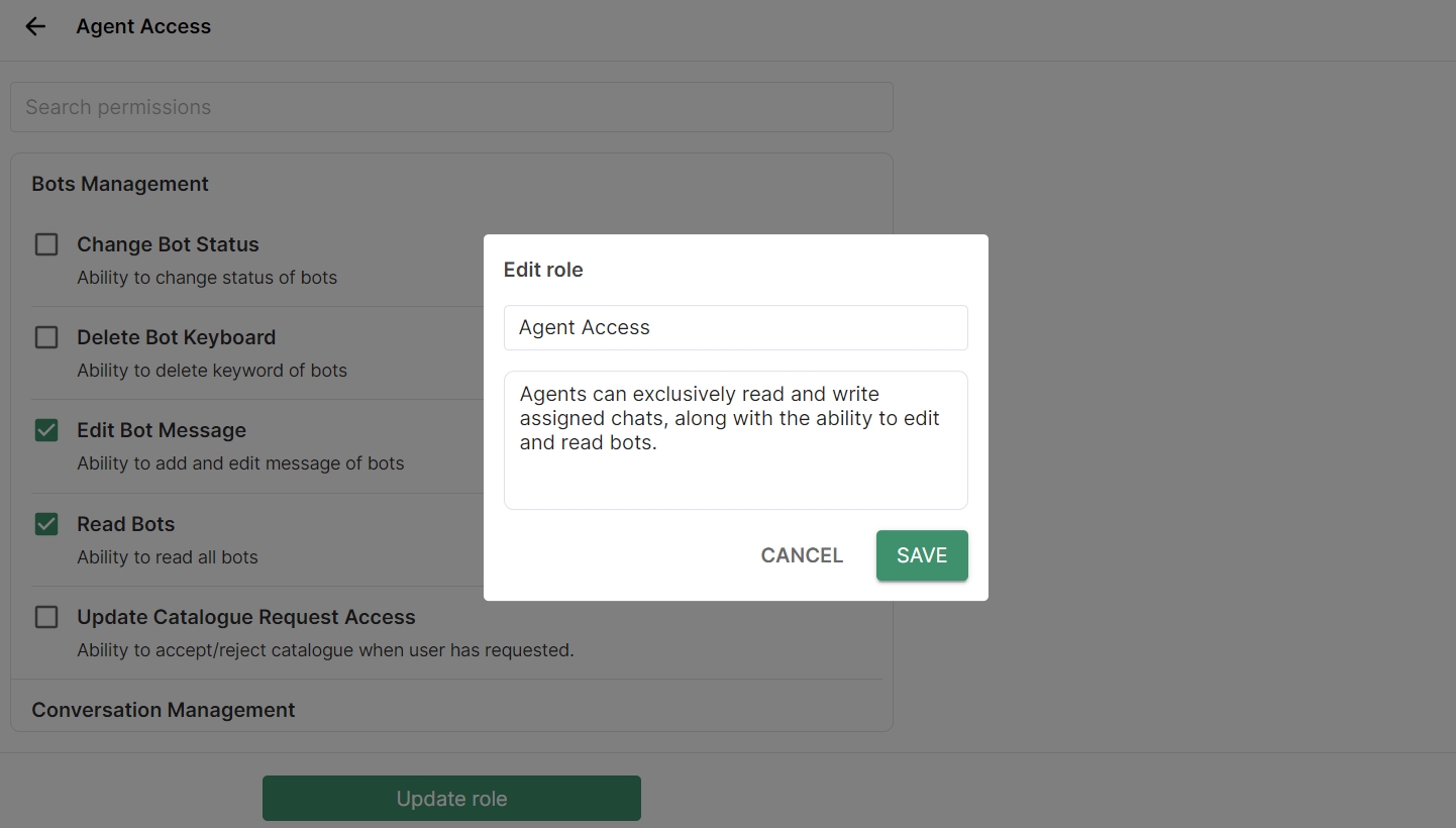 The Custom Create Role feature enables you to assign specific rights for WhatsApp Accounts features, such as