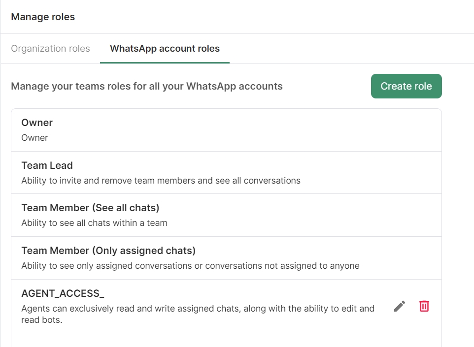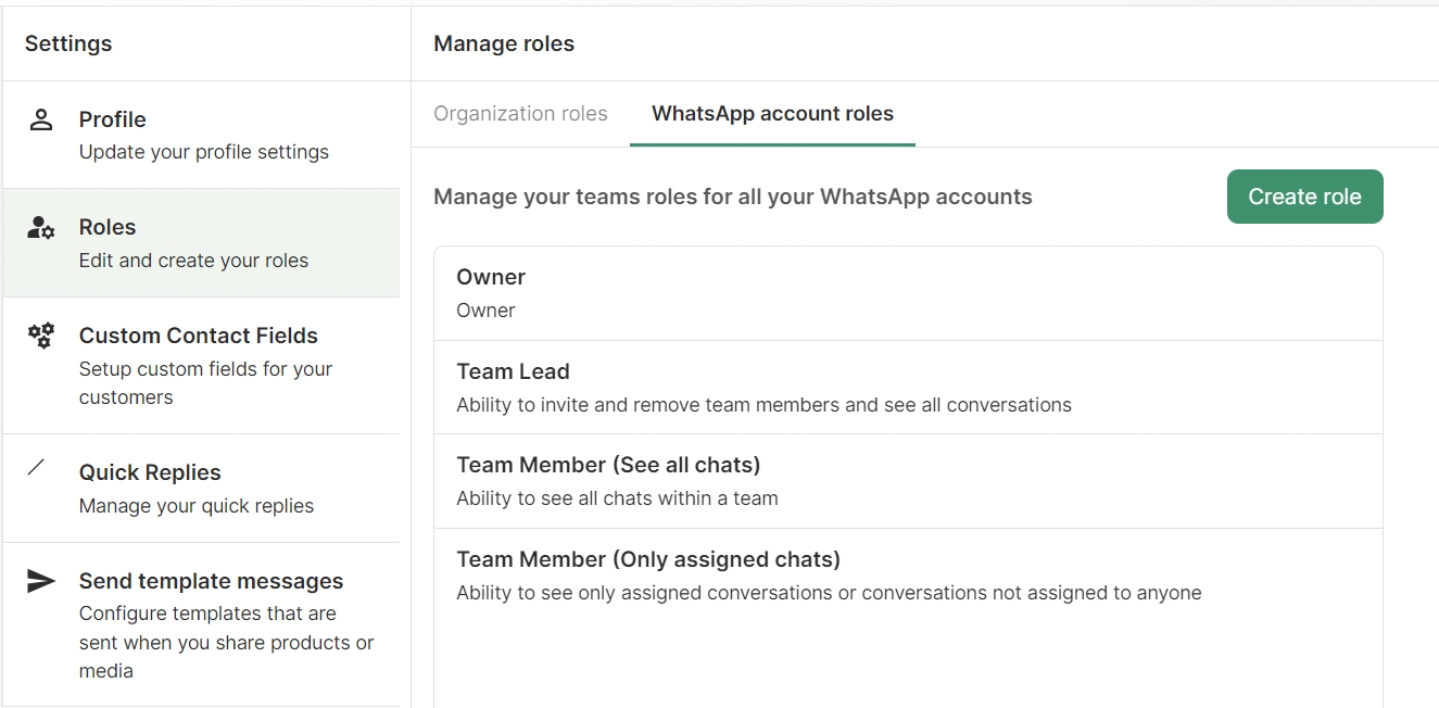To create custom WhatsApp Account roles, Click on the Create role button.