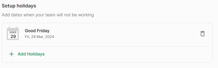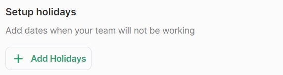 To set up holidays, access the holiday configuration. Add the dates corresponding to the holidays when your team will be off.