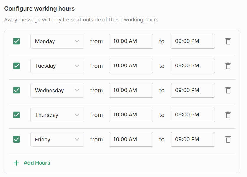 If your working hours span from Monday to Friday, you can configure them as follows: