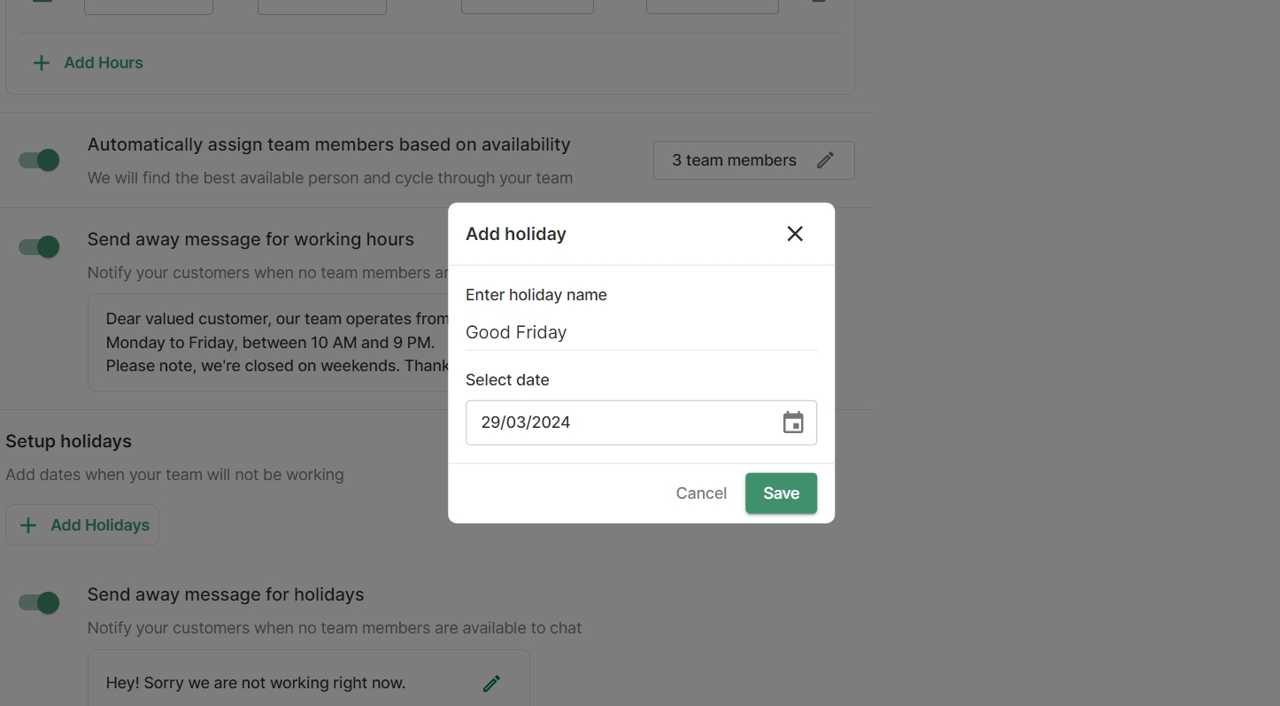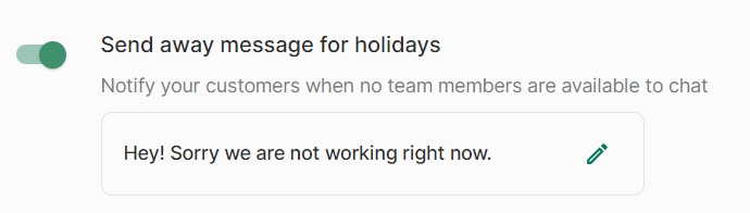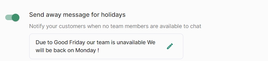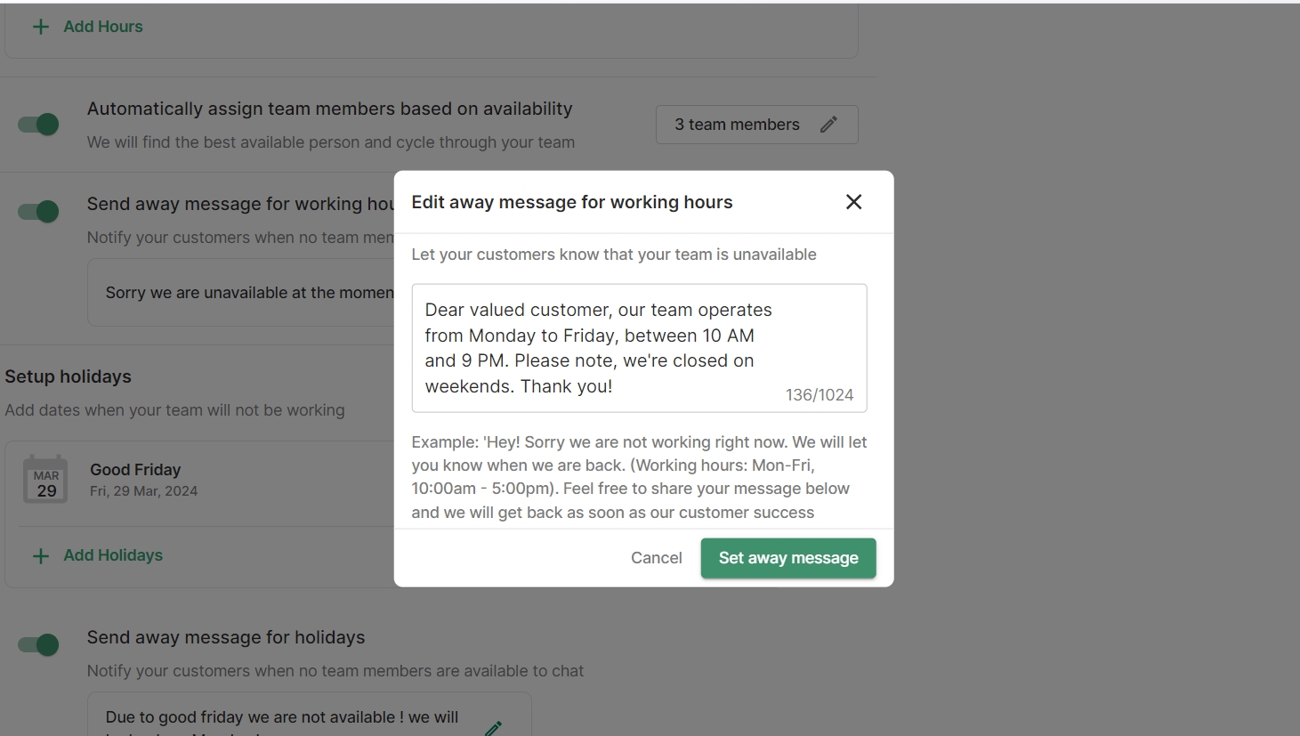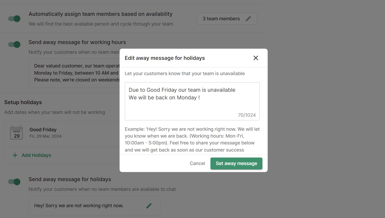 Customize the away message for holidays to notify customers of team unavailability during those times.
