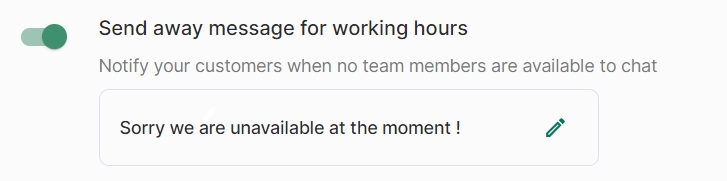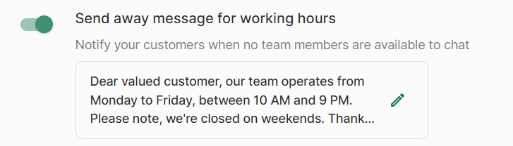 During working hours, if no team members are available to chat, an automated away message can be sent to notify customers of the unavailability.