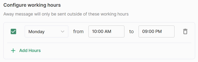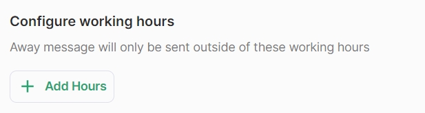 Click on Working Hours to open the configuration panel, where you can define operational hours, assign agents, and customize messages for non-working hours.