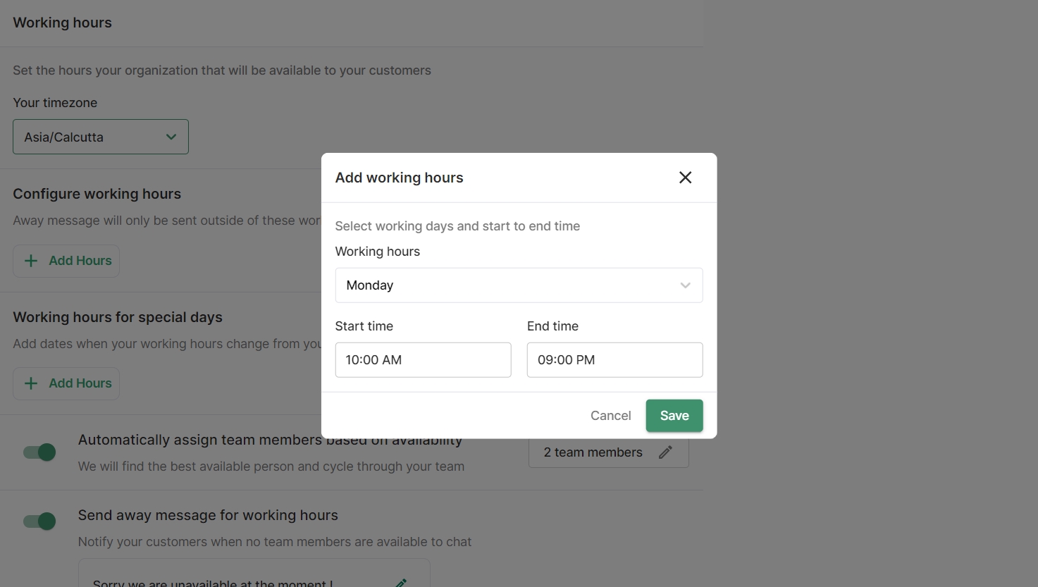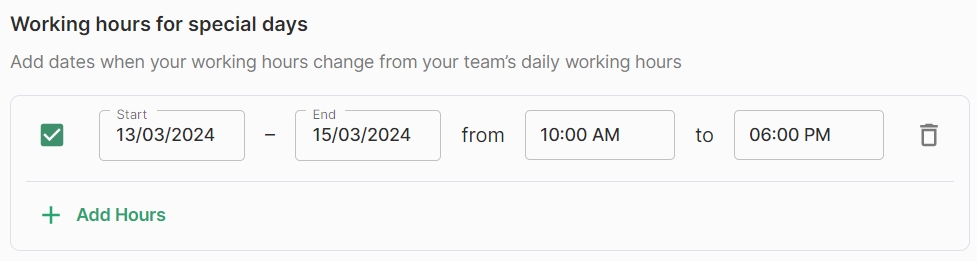 Specify dates for altered working hours when your team's schedule diverges from the usual daily operating hours.