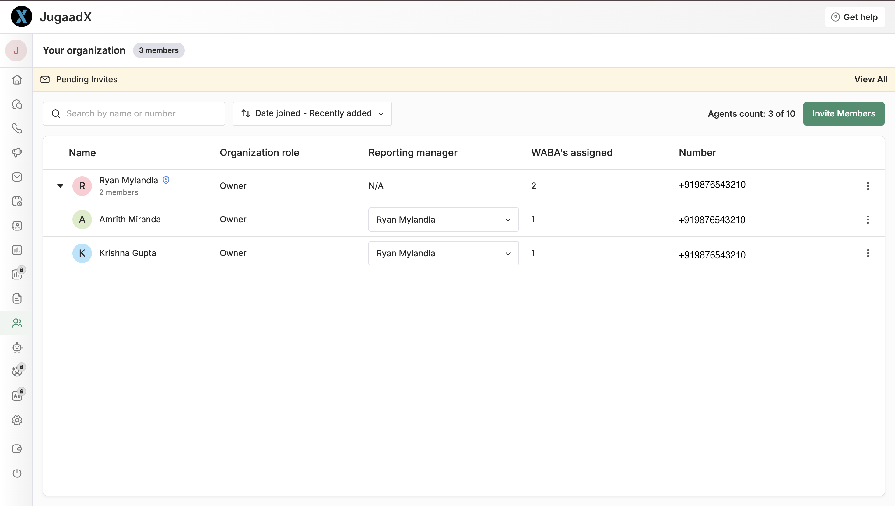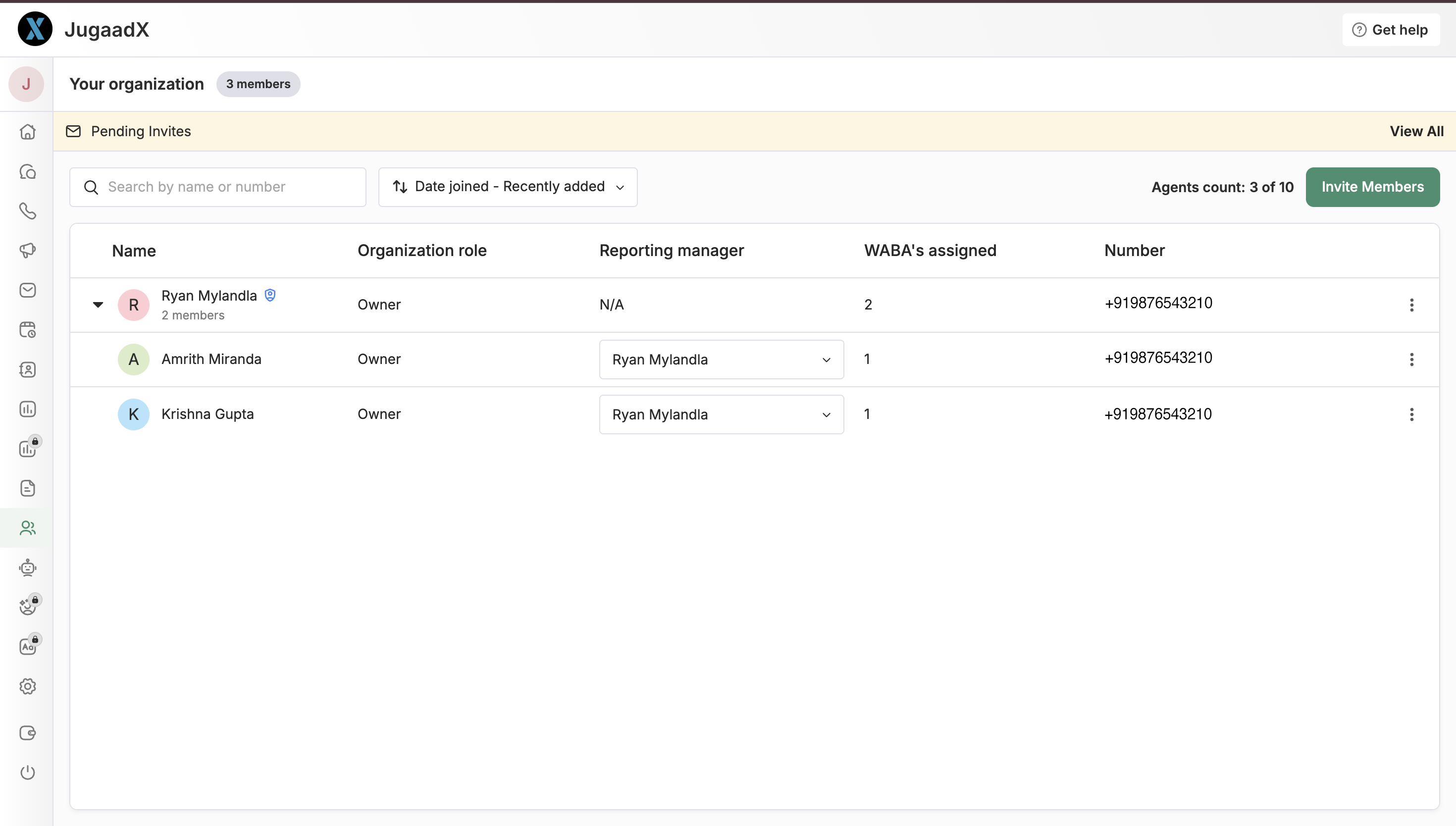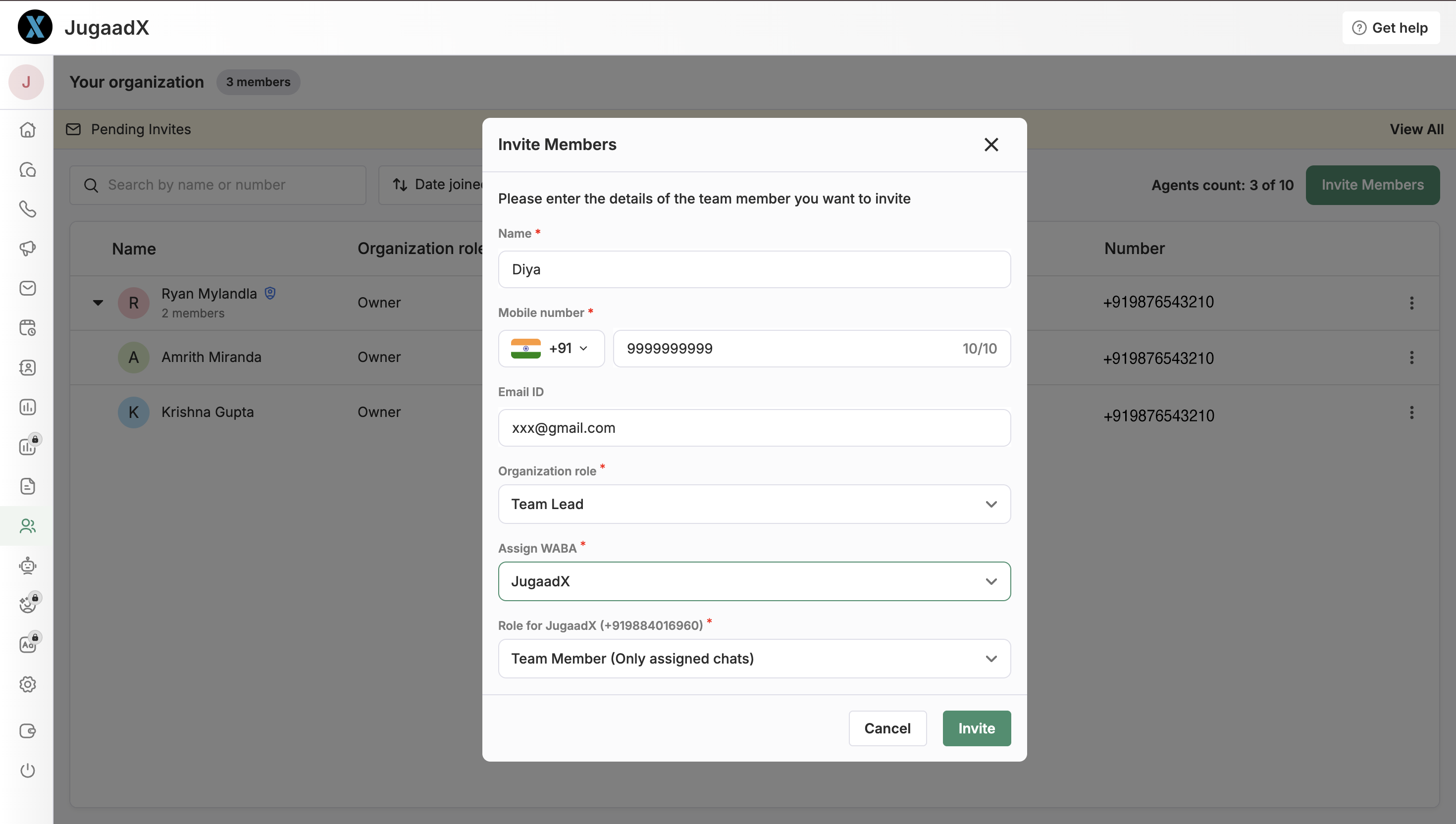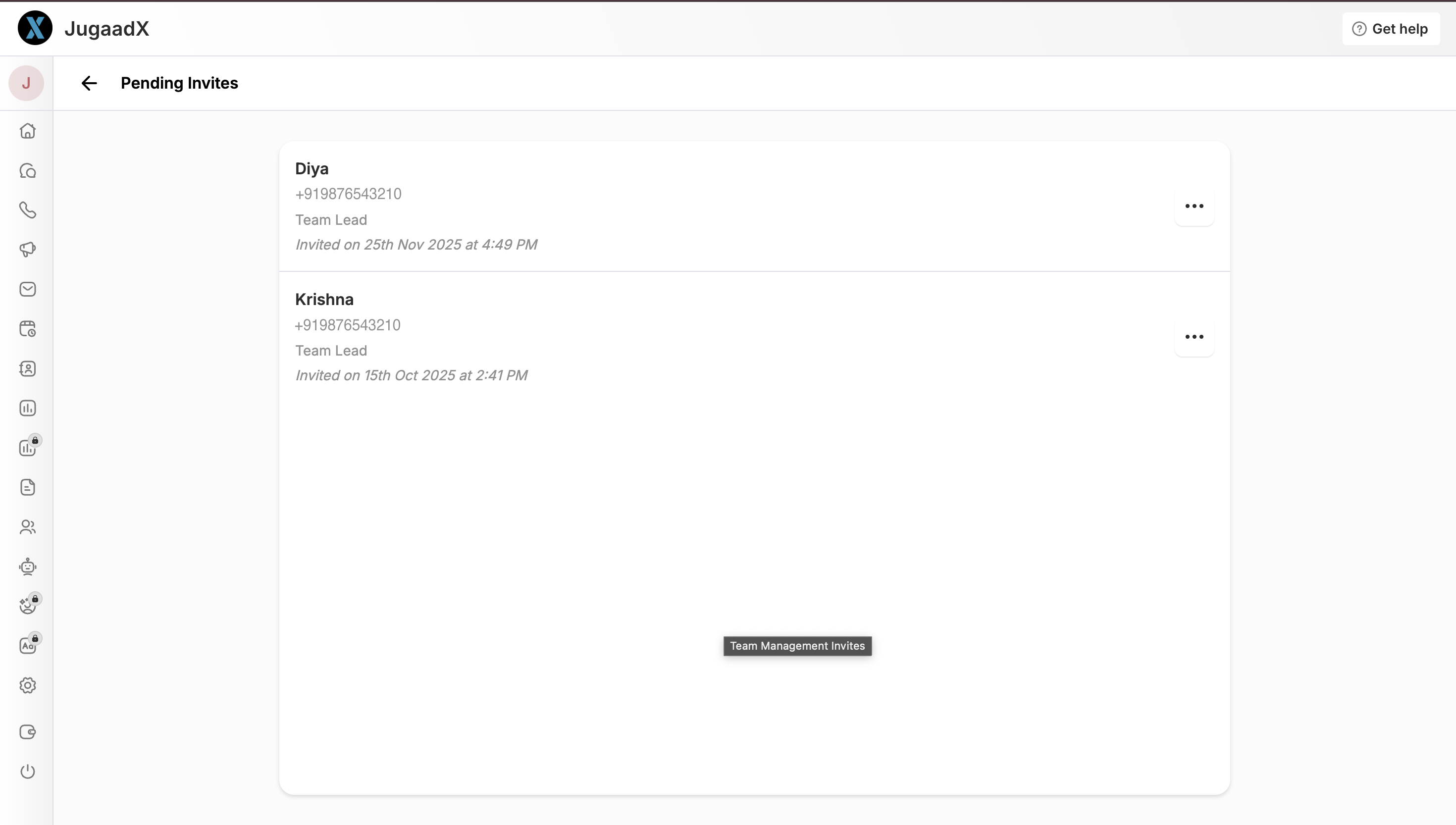 Learn how to invite team members to JugaadX. Add members by entering their details, assign roles, and manage pending invites or revoke them as needed.