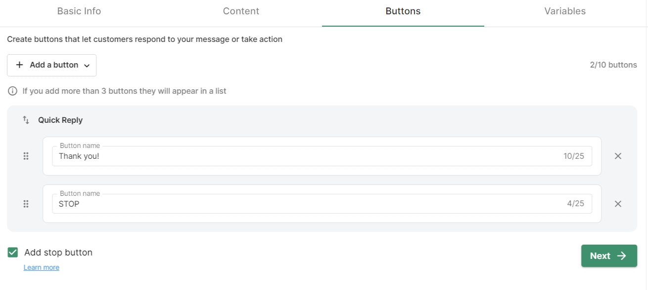 Templates are made up of four primary components which you define when you create a template: header, body, footer, and buttons. The components you choose for each of your templates should be based on