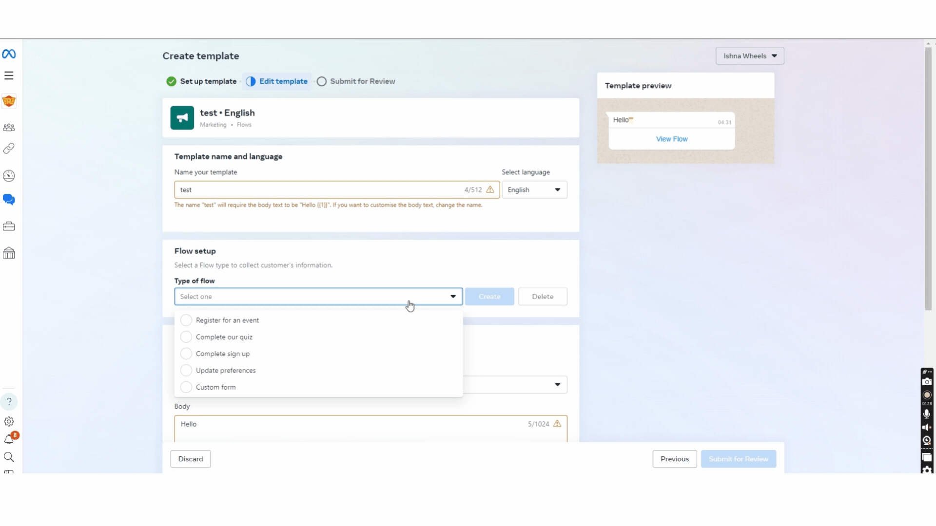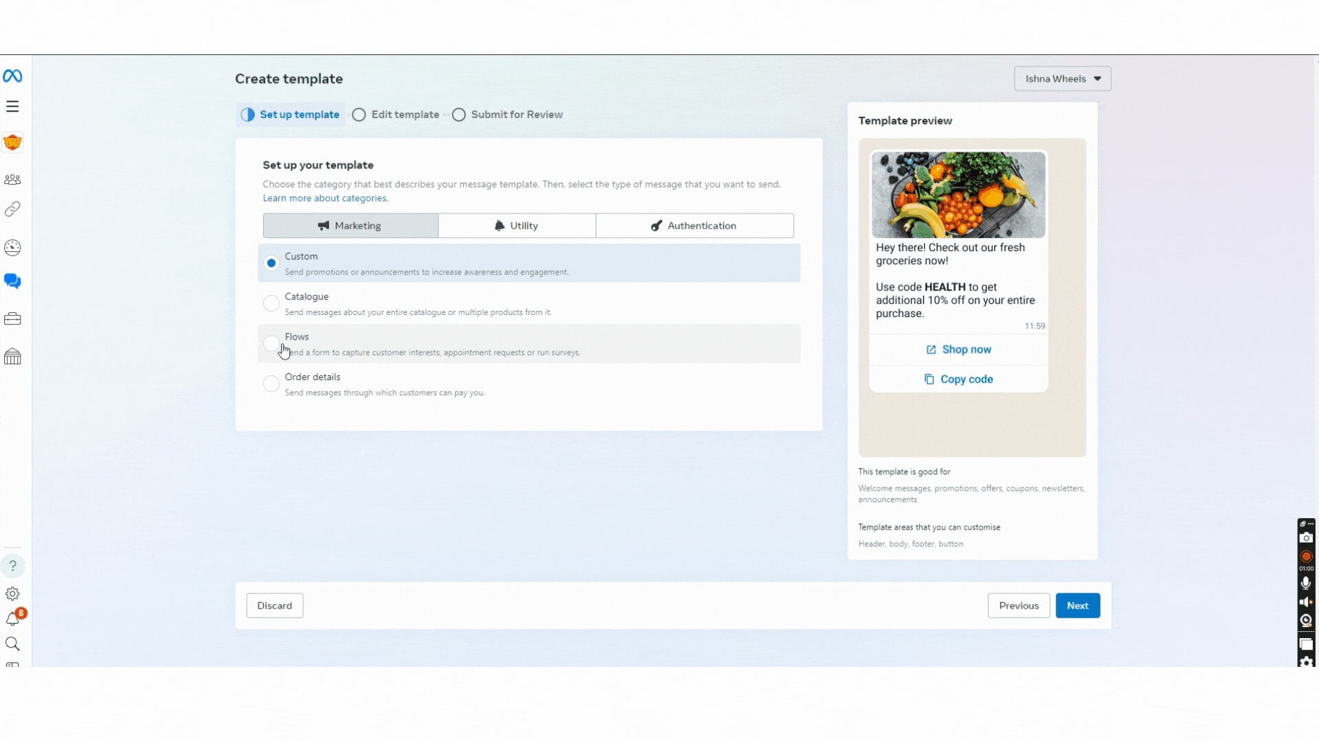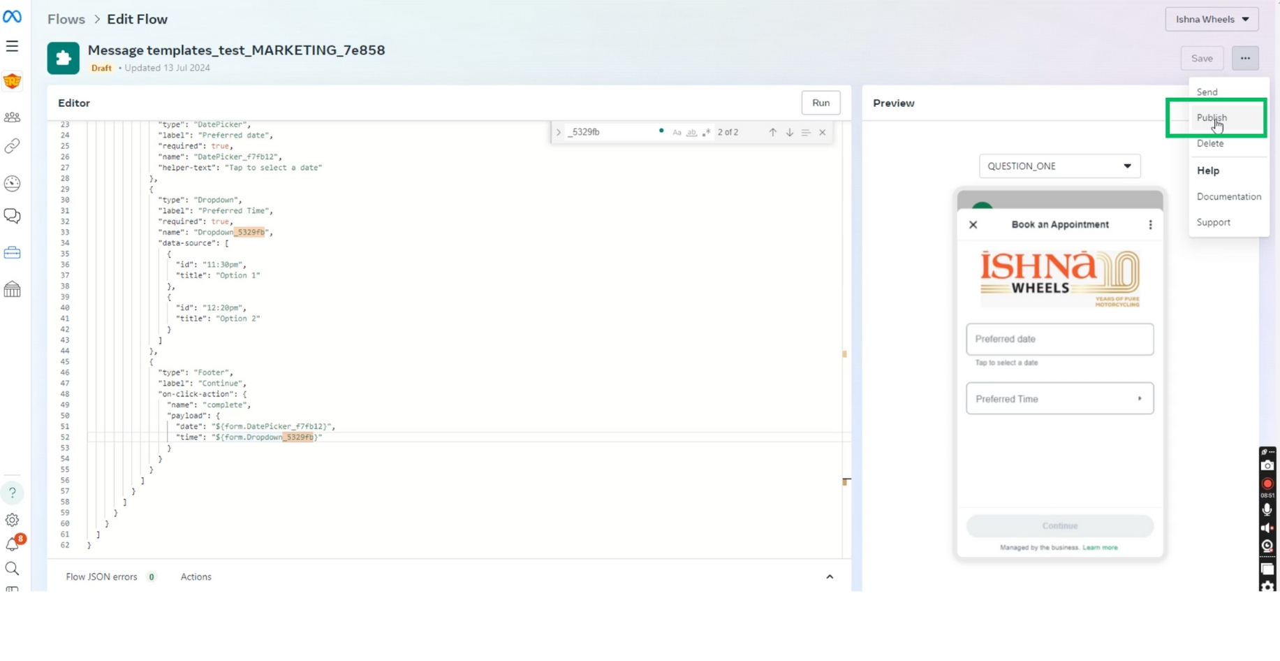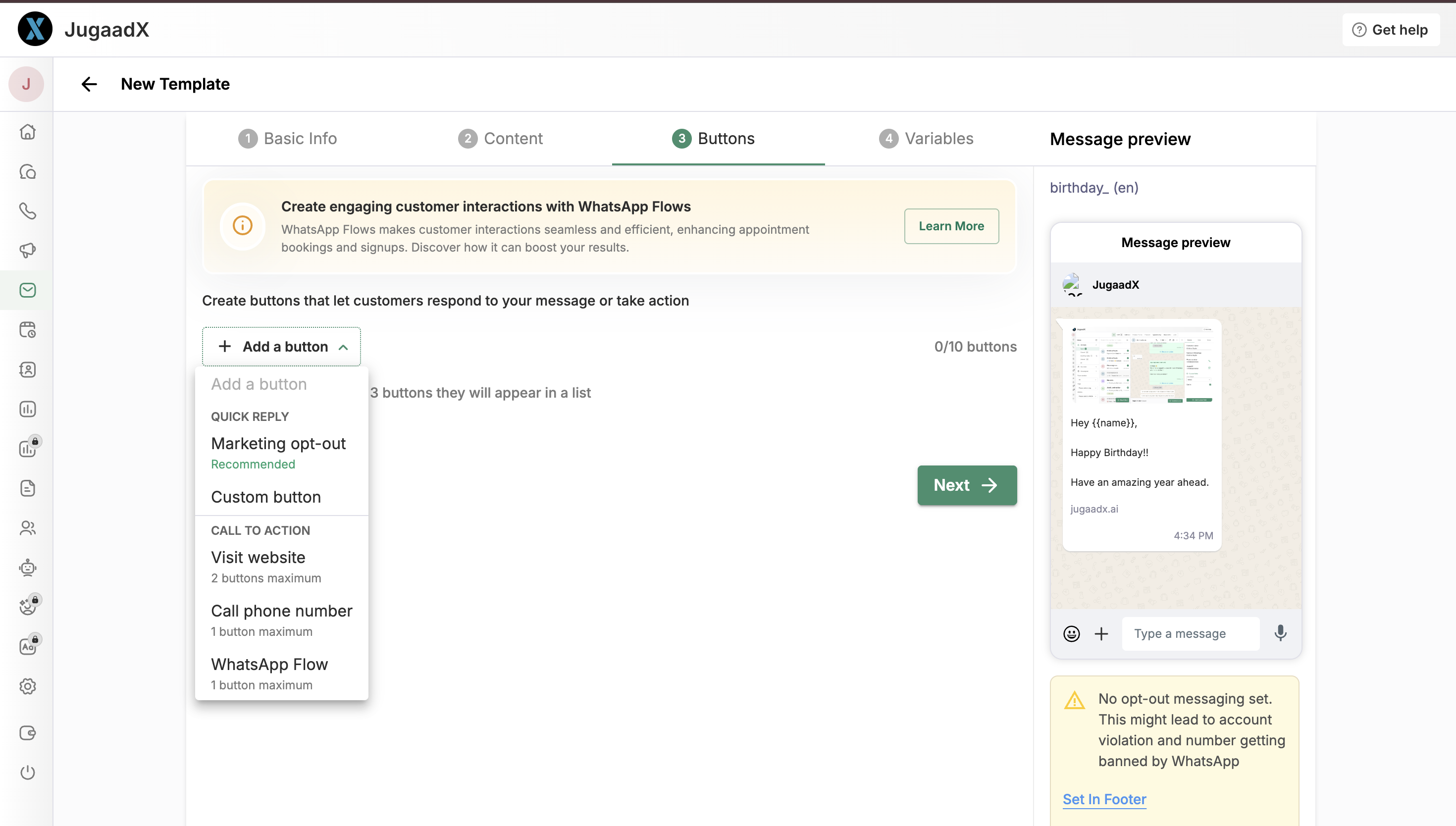 Step 9: Once published, the flows will reflect in your JugaadX account in the 'buttons' tab while creating a new template