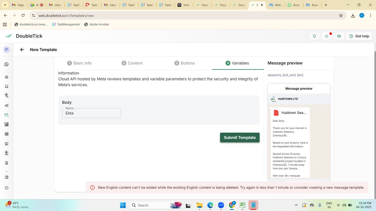 “New English content cannot be added while the existing English content is being deleted. Try again in less than a minute or consider creating a new message template.”